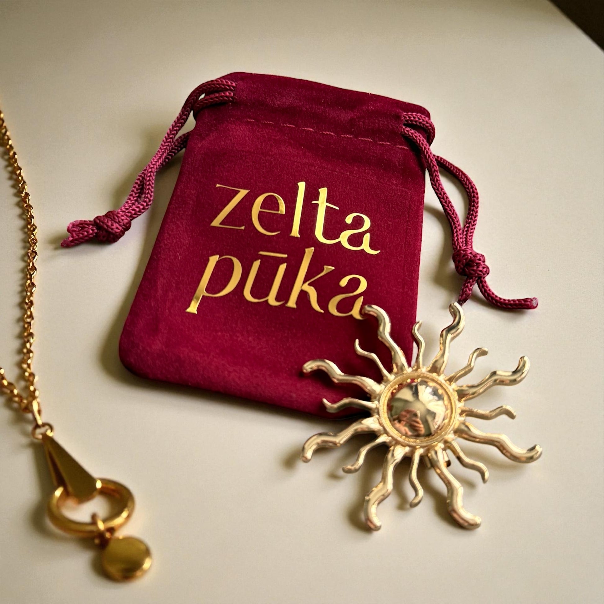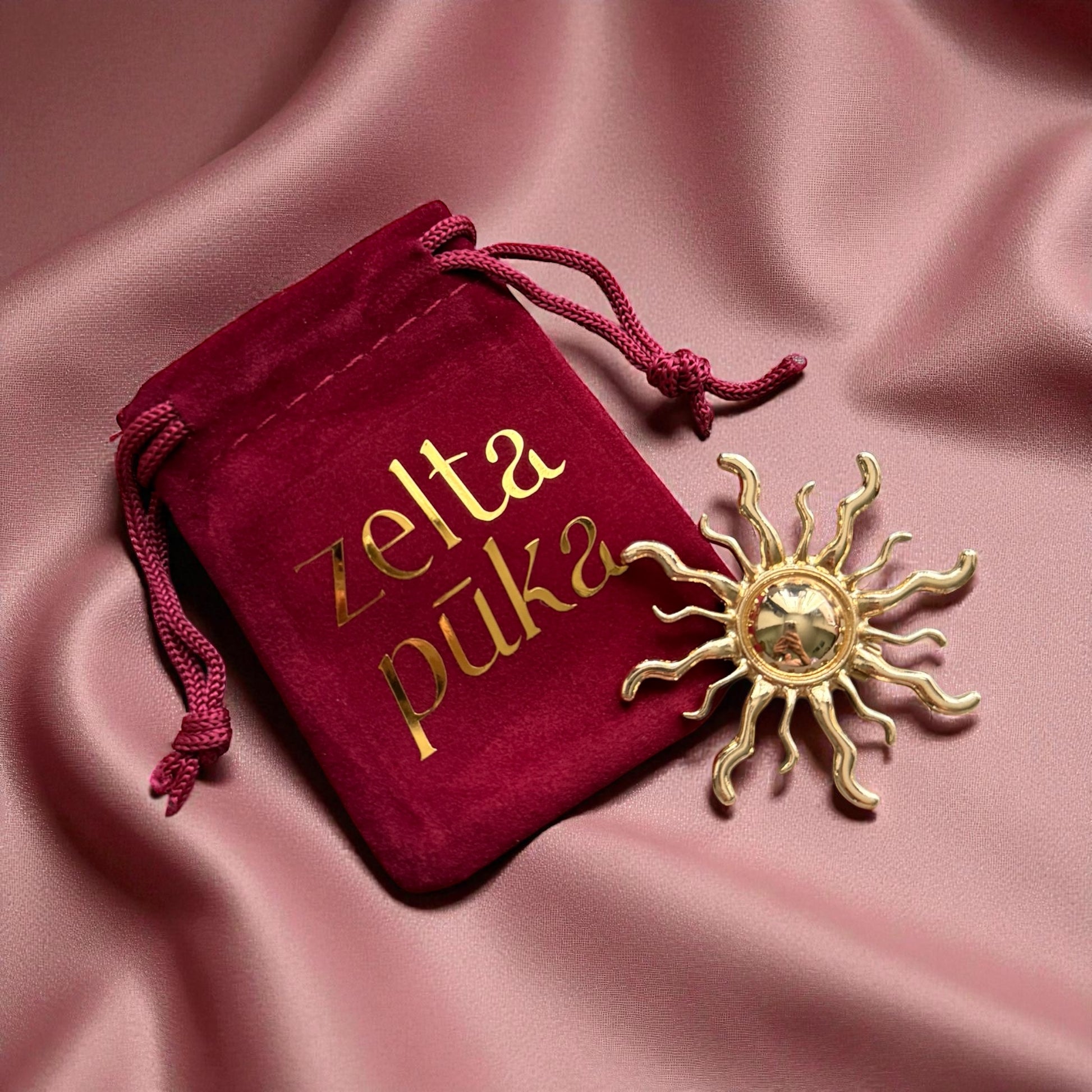 Eleganta saules formas piespraude, kas simbolizē spēku, dzīvību un sievišķo gaismu. Radīta tiem brīžiem, kad vēlies izcelties – ar stilu, pārliecību un mirdzumu. Stilīgs akcents mētelim, žaketei vai somai.