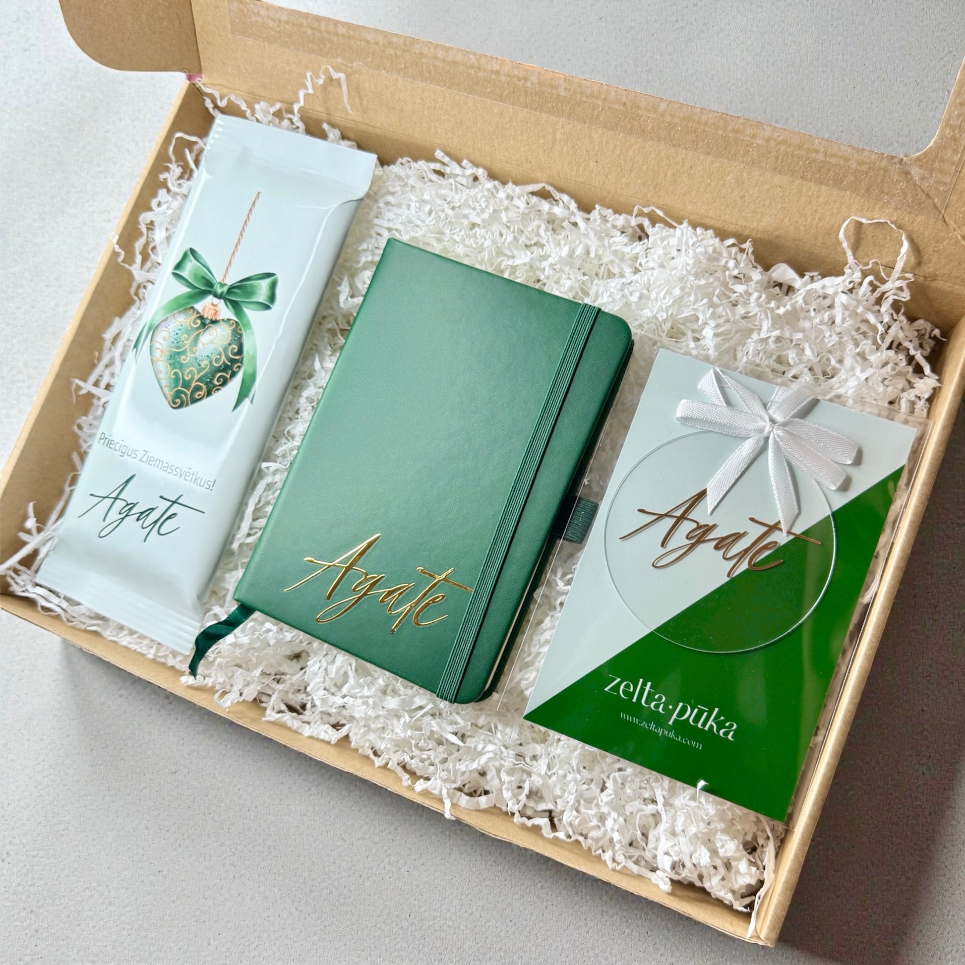 Dāvanu komplekts ar personalizētiem produktiem zaļos toņos. Skaisti iesaiņots kartona kastītē ar papīra skaidām un apsiets ar džutas aukliņu. Iepriecini sev tuvos ar pārdomātu, personalizētu un unikālu dāvanu.