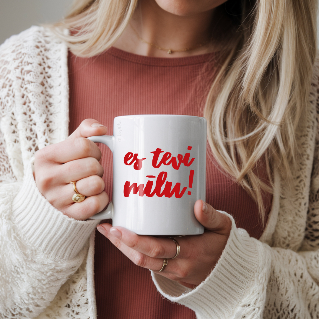 Balta keramikas krūze ar uzrakstu “Es tevi mīlu”.