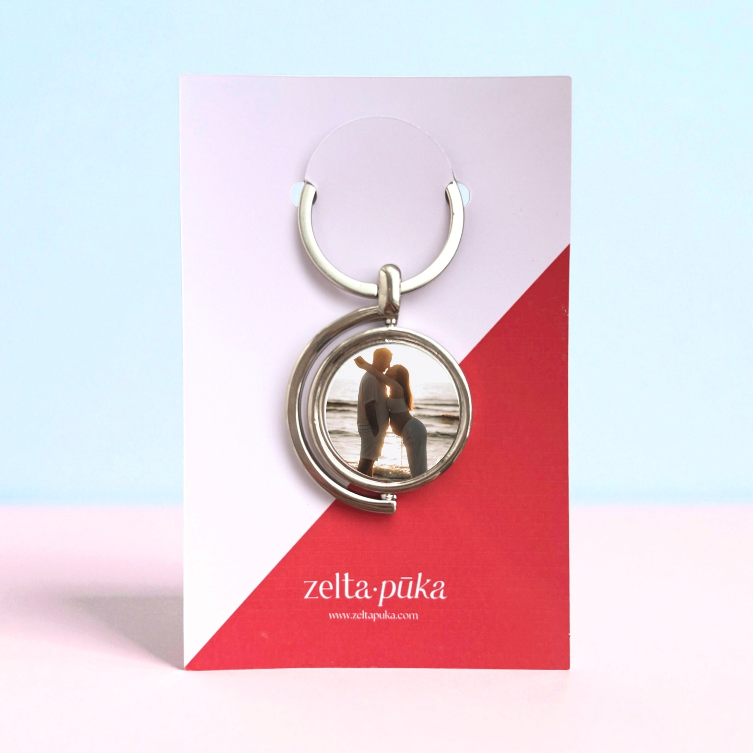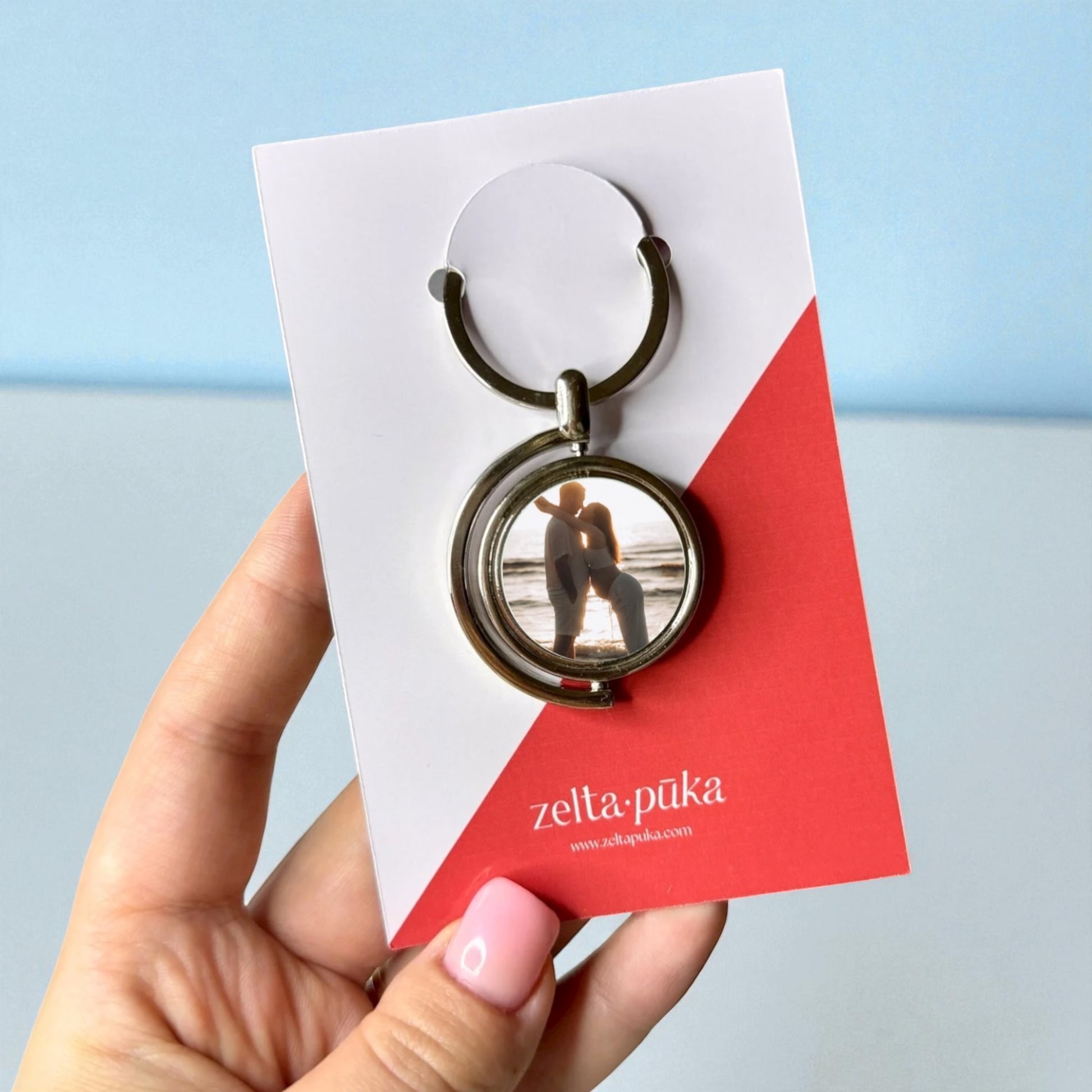 Minimālistisks rotējošs atslēgu piekariņš ar jūsu fotogrāfiju no abām pusēm. Šis atslēgu piekariņš izgatavots no metāla sudraba krāsā.