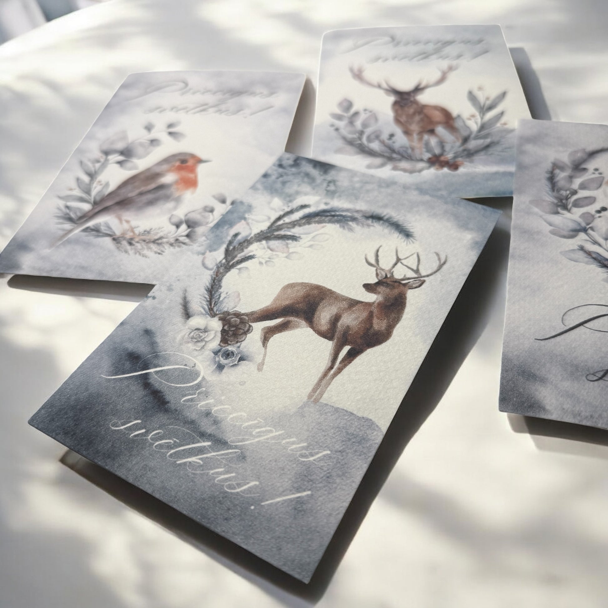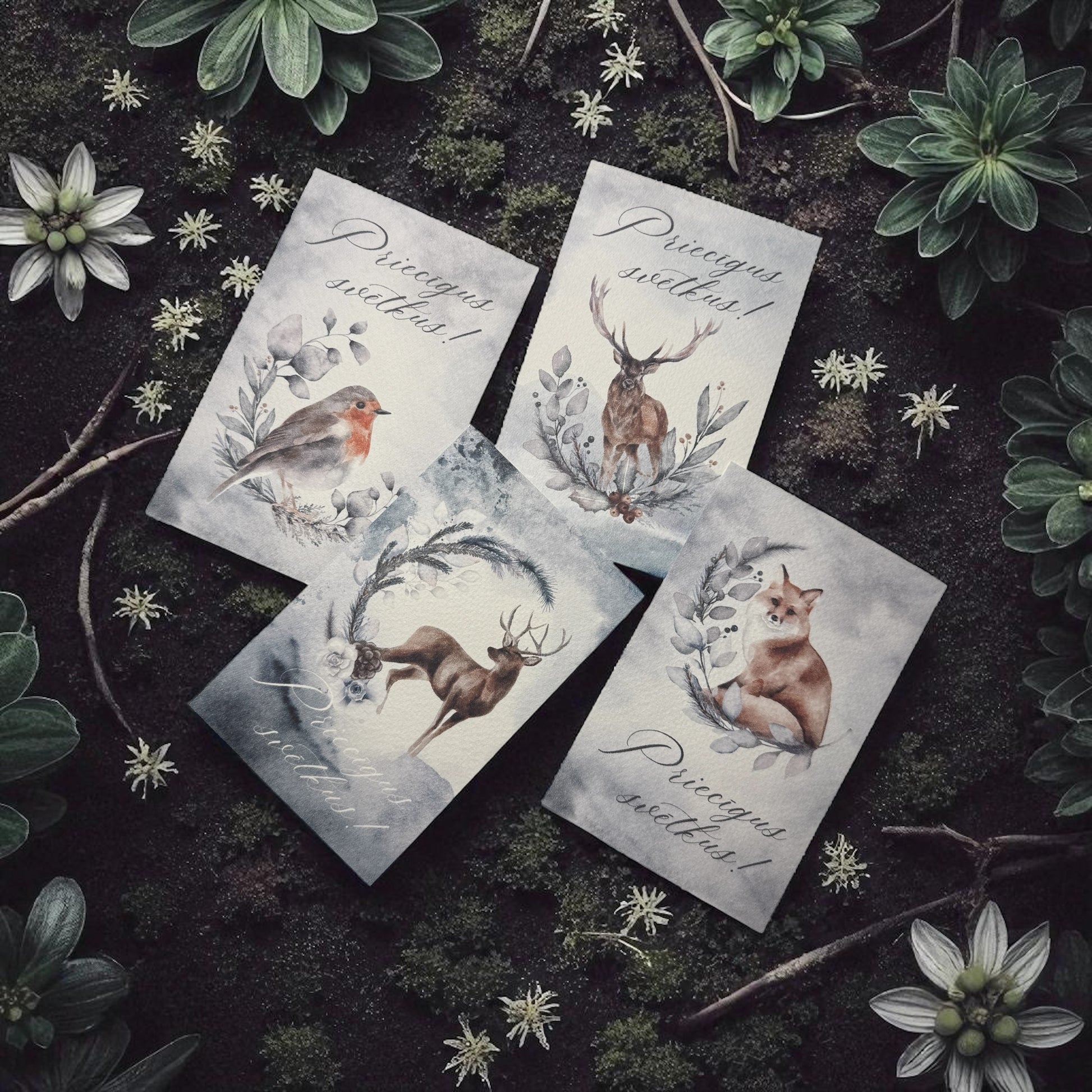 Nelielas akvareļu stila kartītes ar meža dzīvniekiem un uzrakstu "Priecīgus svētkus!" Ziemassvētku apsveikuma kartiņas, kas izstaro klusumu, mieru un ziemeļniecisku pasaku burvību.